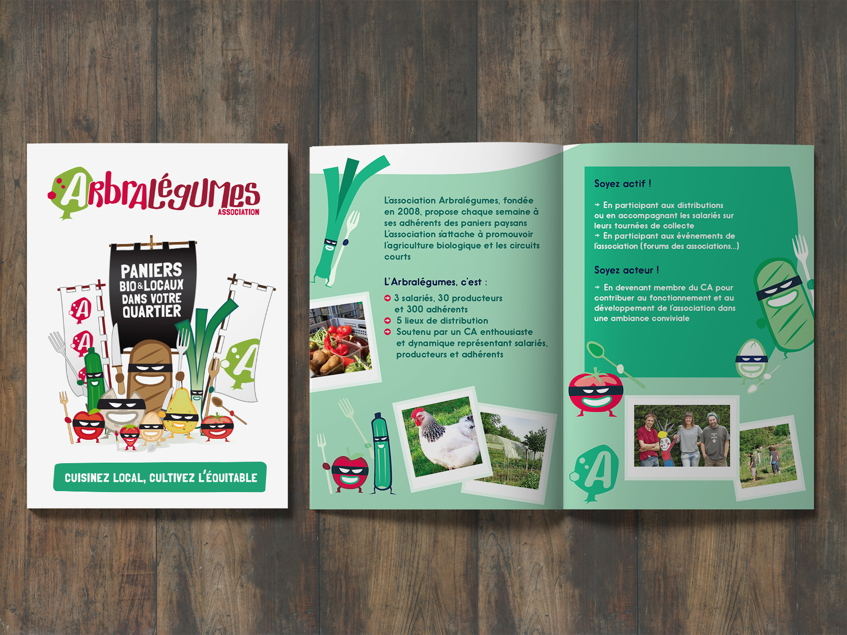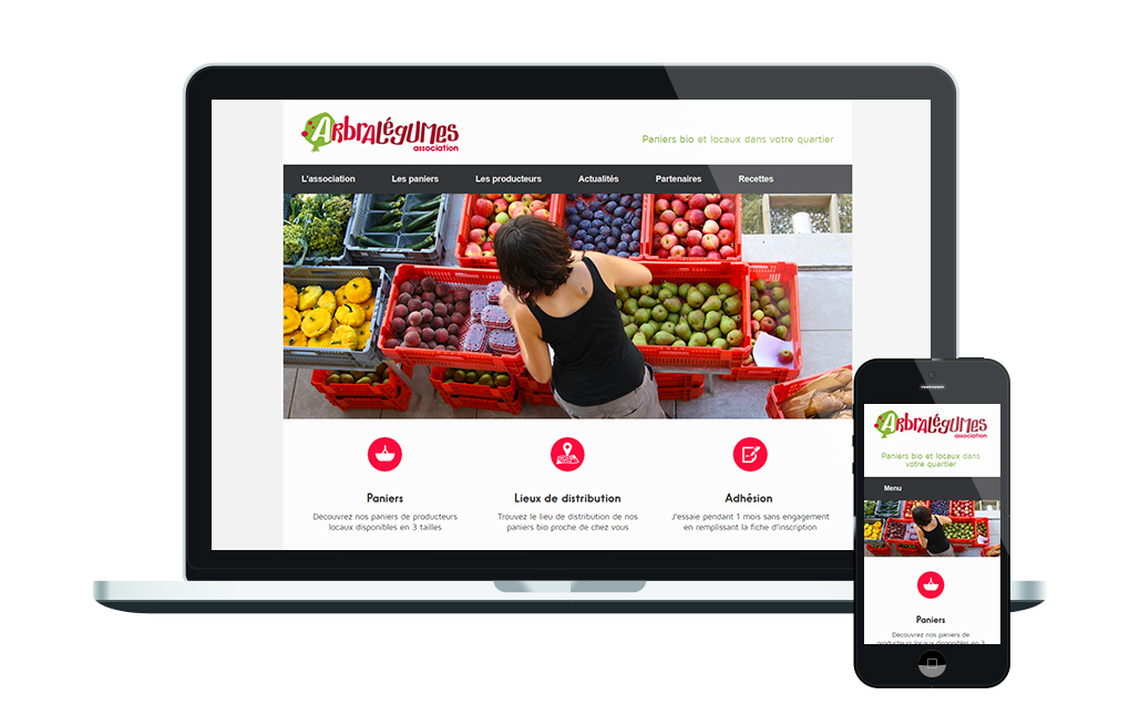 Création du webdesign à partir de la communication existante ludique et conviviale. La communication de l’Arbralégumes est bien identifiable par ses personnages de fruits et légumes masqués, des justiciers de l’agriculture locale !